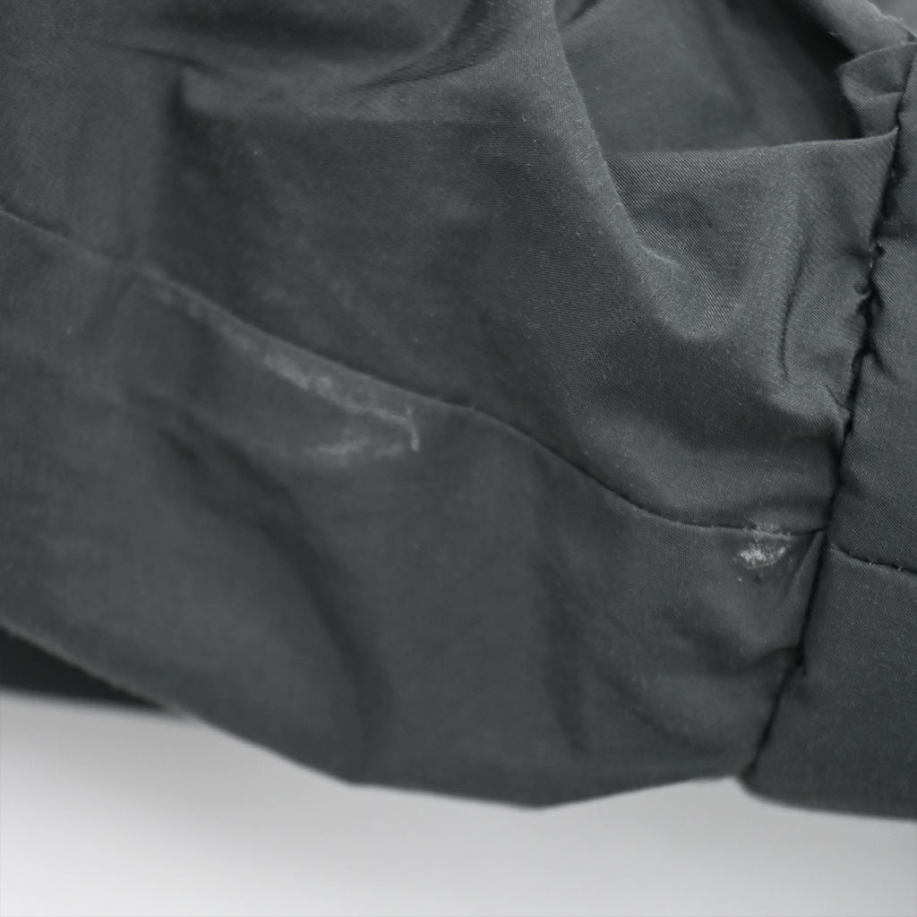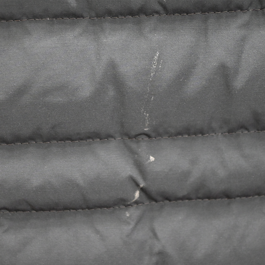 Gently used, with some white spots throughout outer, minor wear from use, & bottom seam of right pocket is coming unstitched.