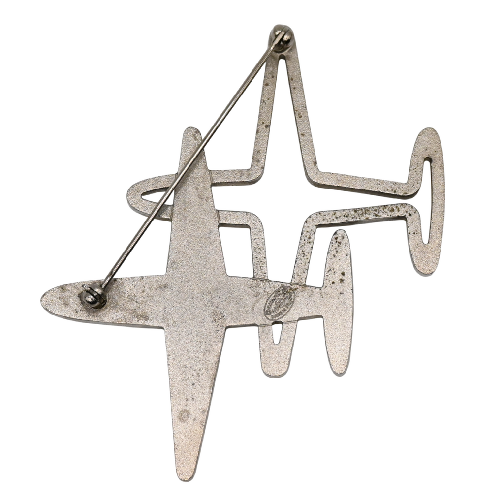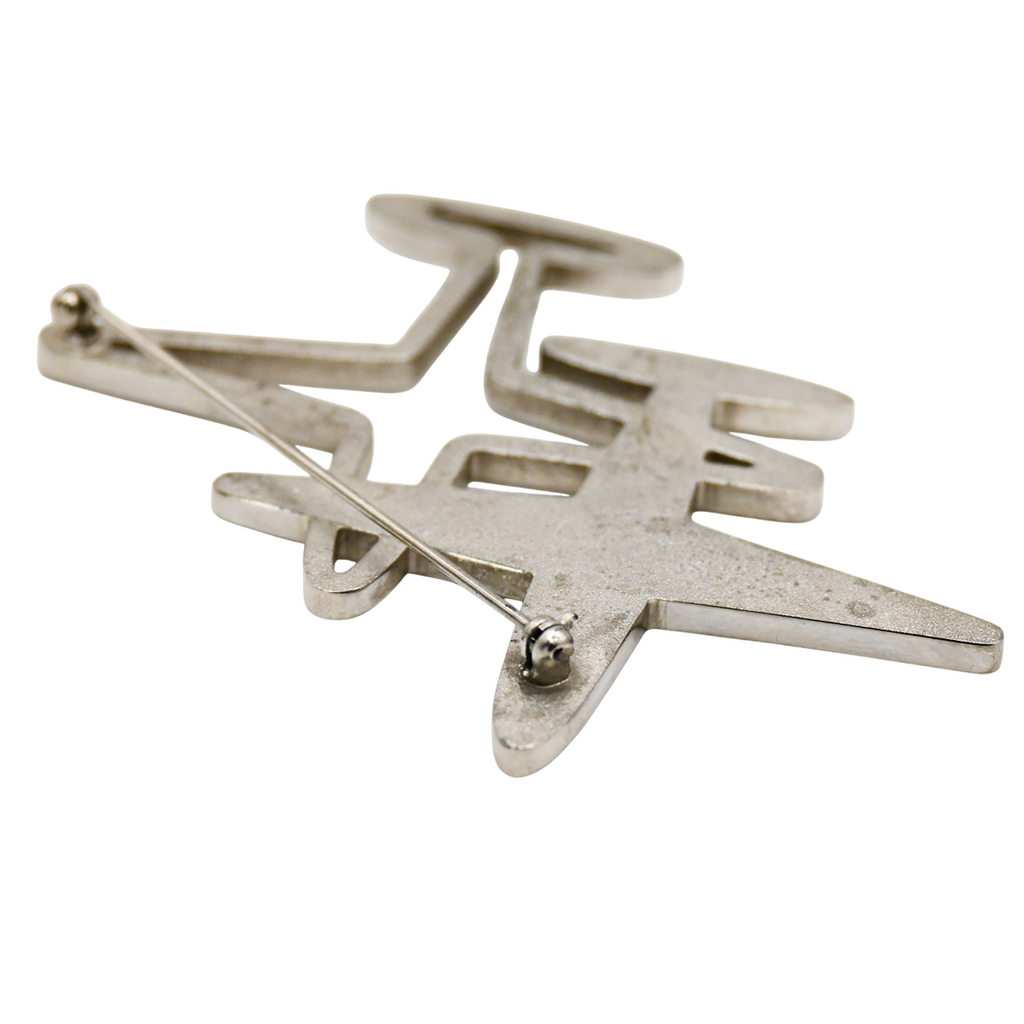 Used, with some light scratching & marks at front, visible discoloration & wear at backside, & pin closure is loosening & can come undone.