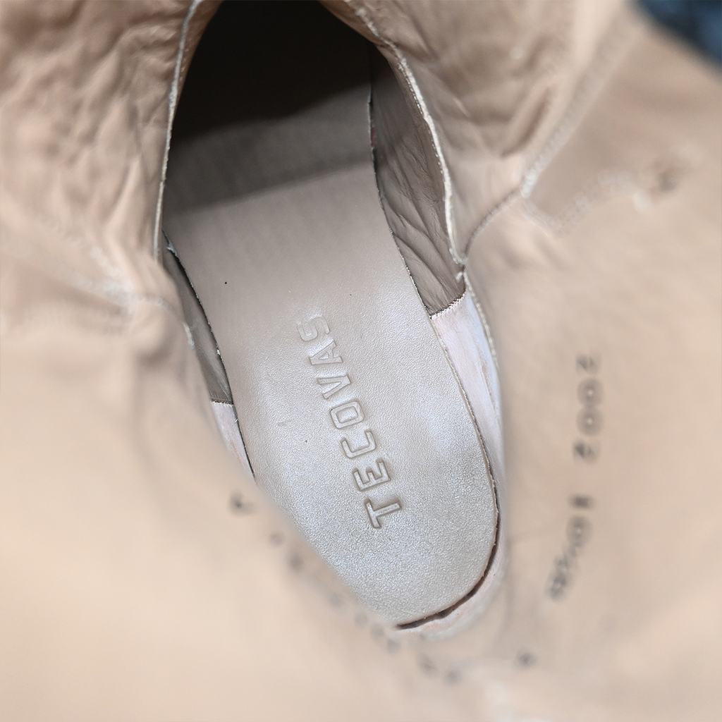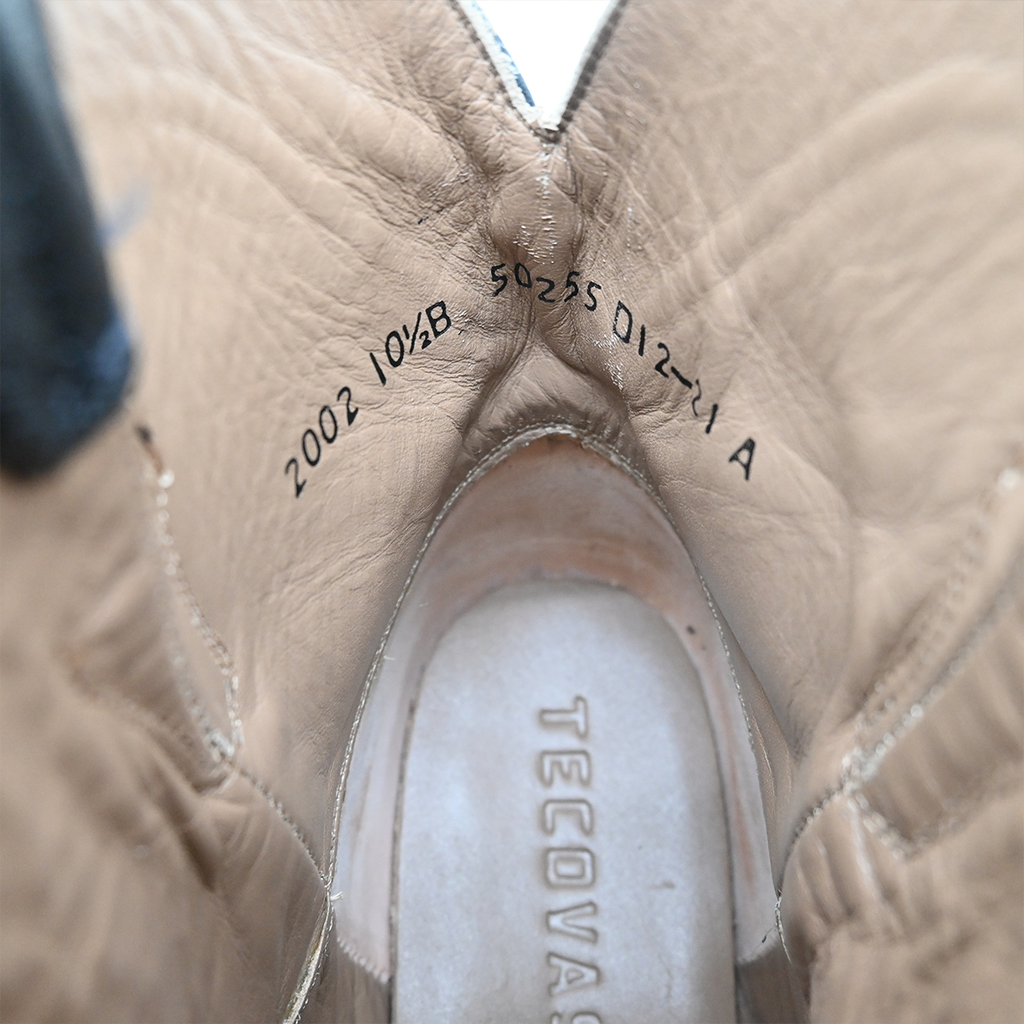 Gently used, with minor wear at the soles & insoles. Some creasing, stains, & scuff marks at the upper leather. Some residue & wear at the interior. Minor cracking at the stacked heels.
