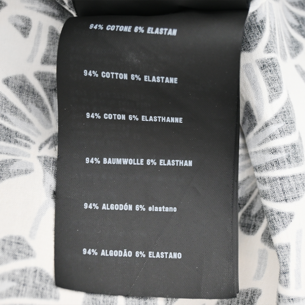 Black, off-white, & gray printed cotton-elastane fabric shell