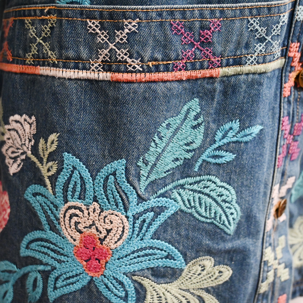 Gently used, with some signs of wear throughout. Some pilling & snags throughout the embroidery. Minor discoloration on the upper denim.
