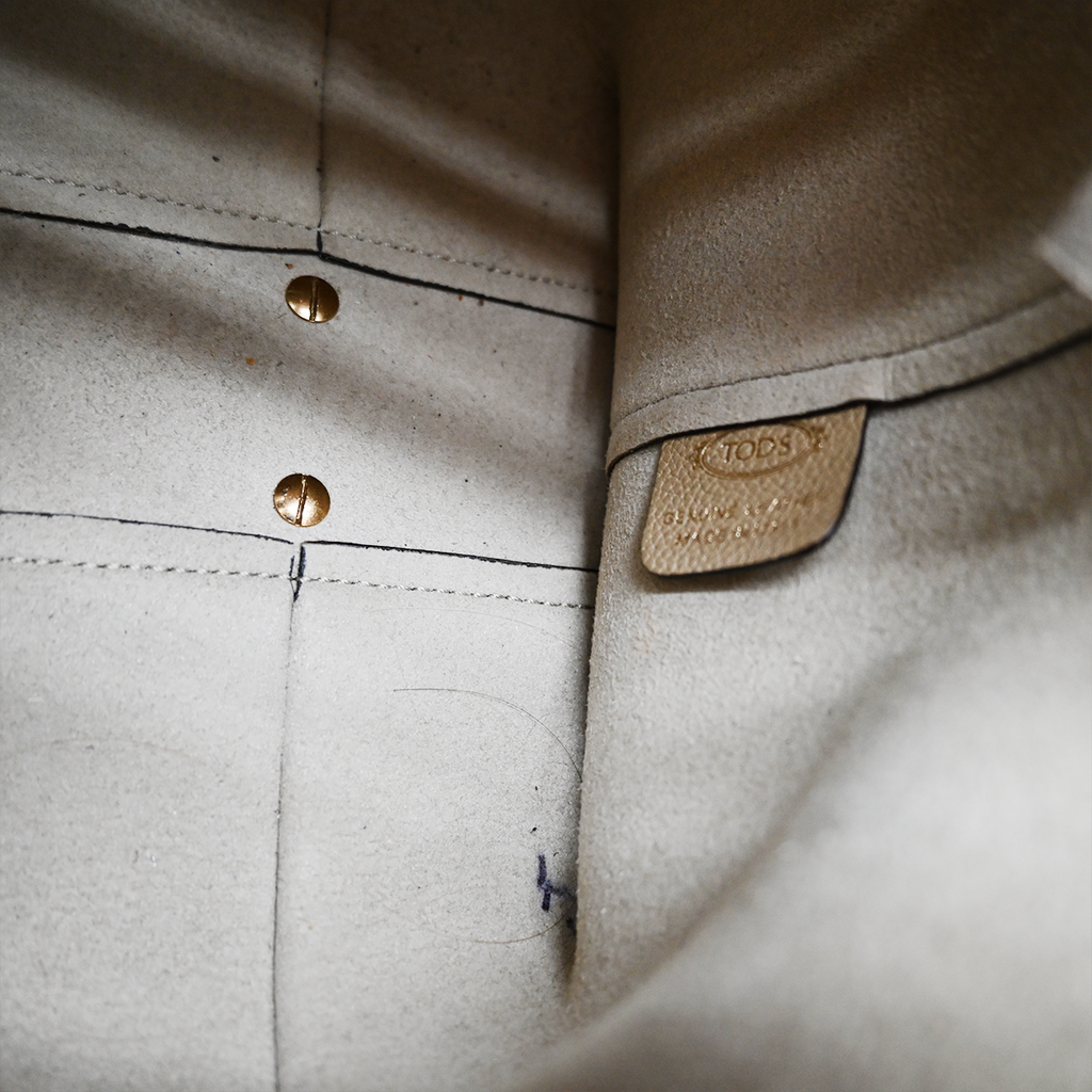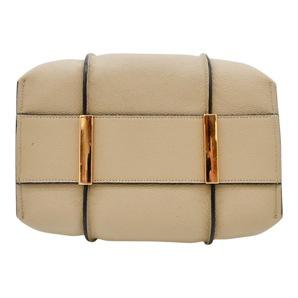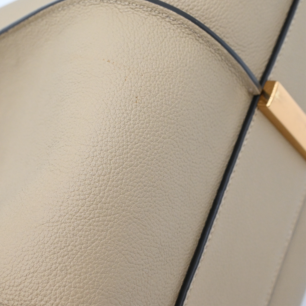 Good, with minor stains & creasing at the upper leather. Minor wear at the top handles & straps. Visible scratches at the hardware.  Some residue & signs of wear at the interior.