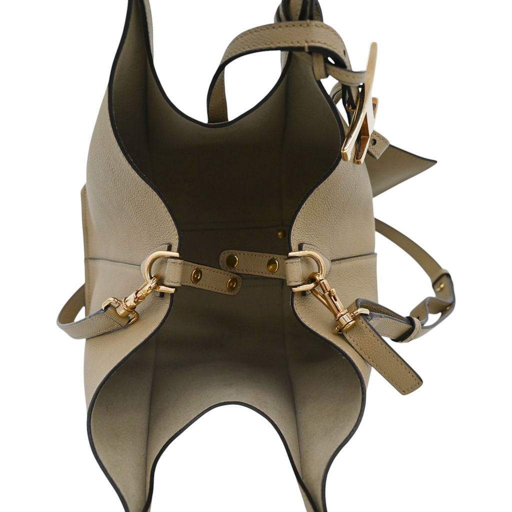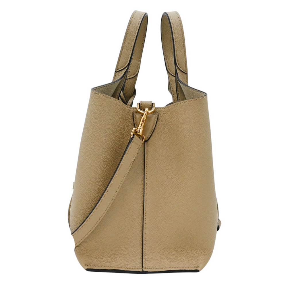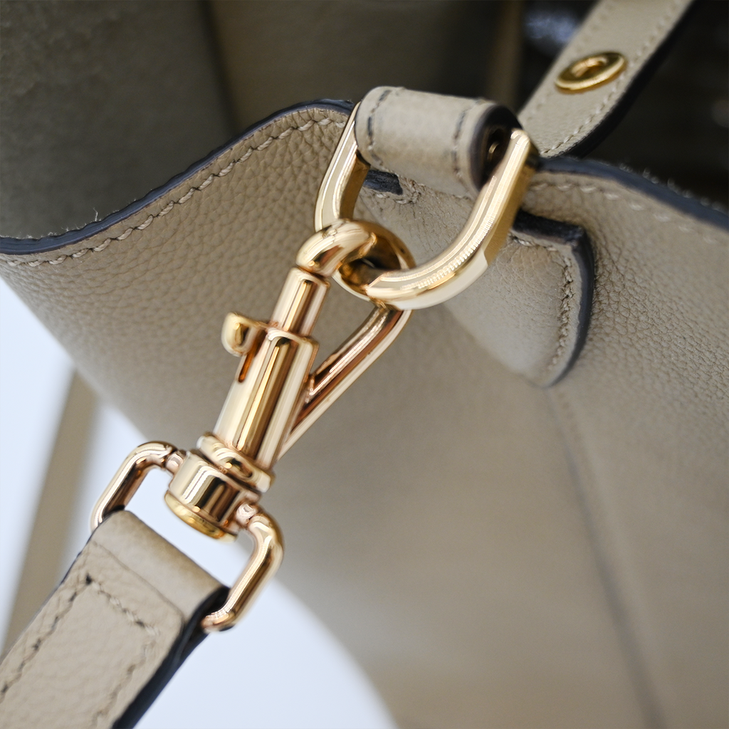Good, with minor stains & creasing at the upper leather. Minor wear at the top handles & straps. Visible scratches at the hardware.  Some residue & signs of wear at the interior.