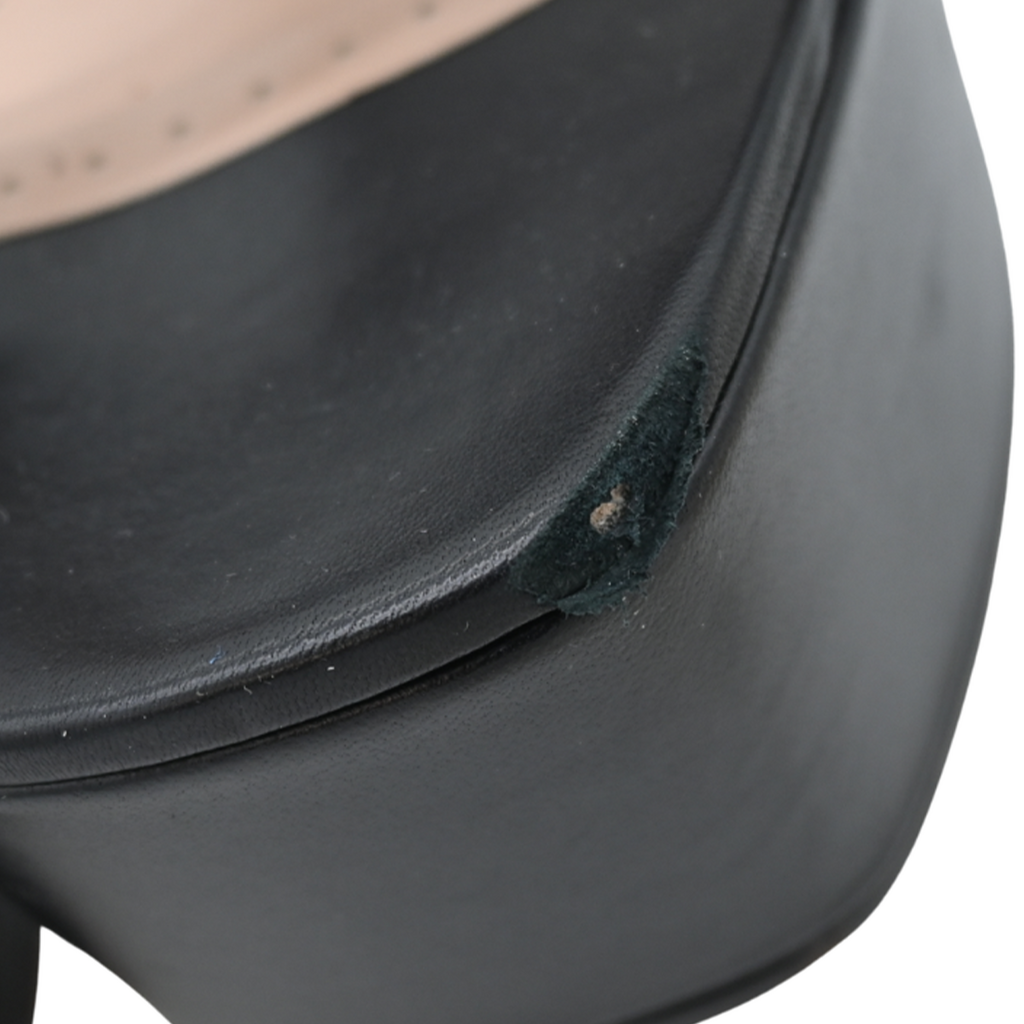 Used, with some wear at the soles & insoles. Some visible creasing & minor scuff marks on the upper leather. Some stains & residue in the interior. Minor stains on the satin straps. Major tears at the leather toes, midsoles, & straps.