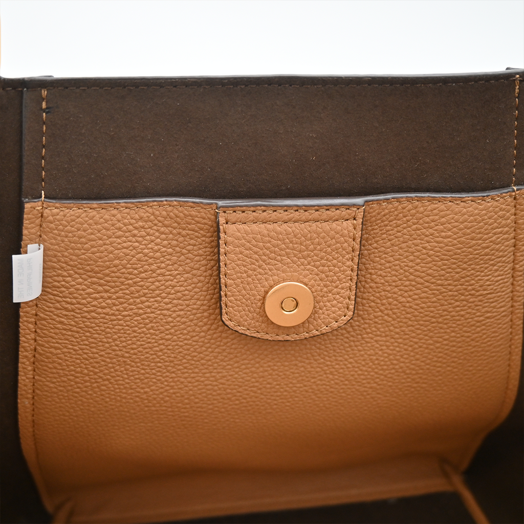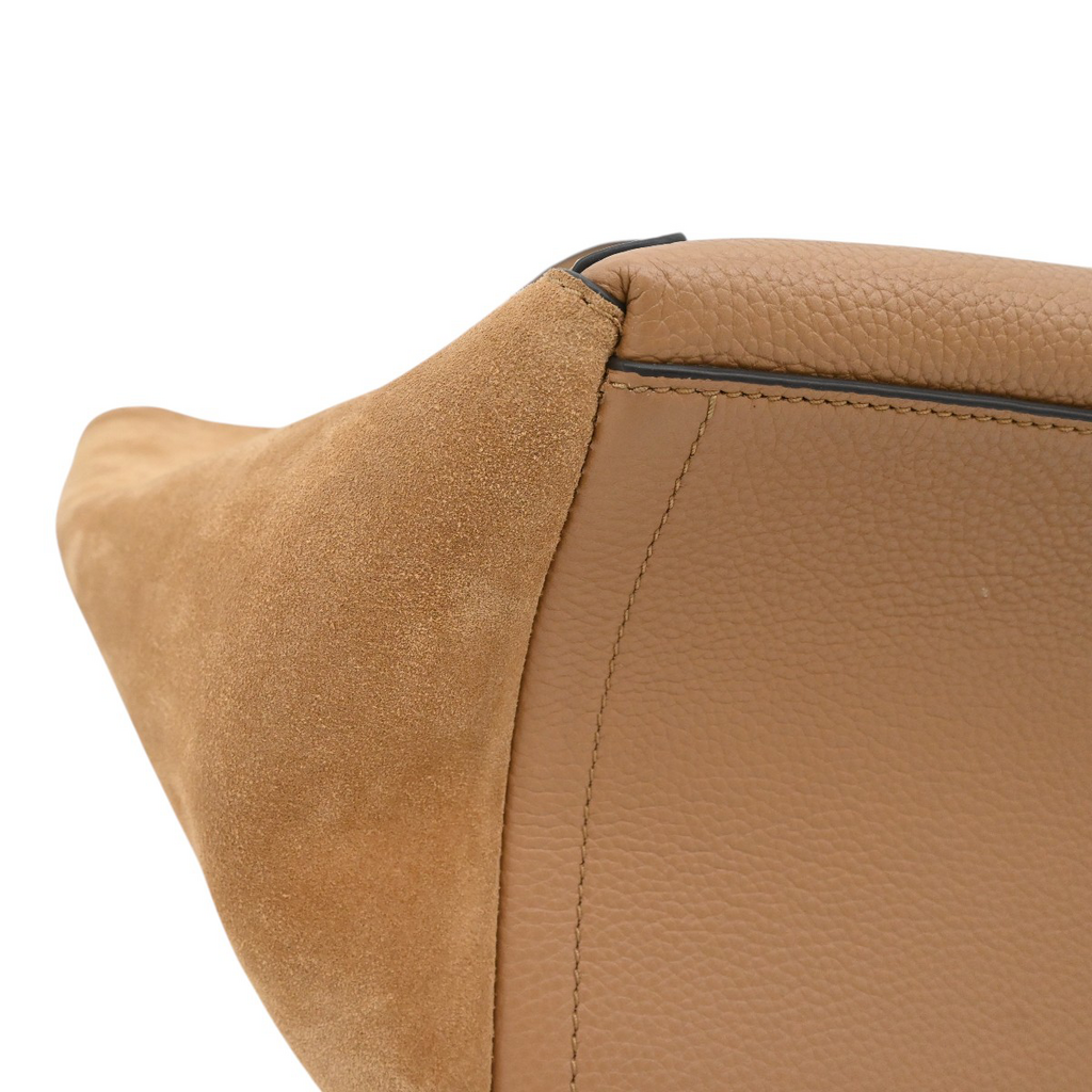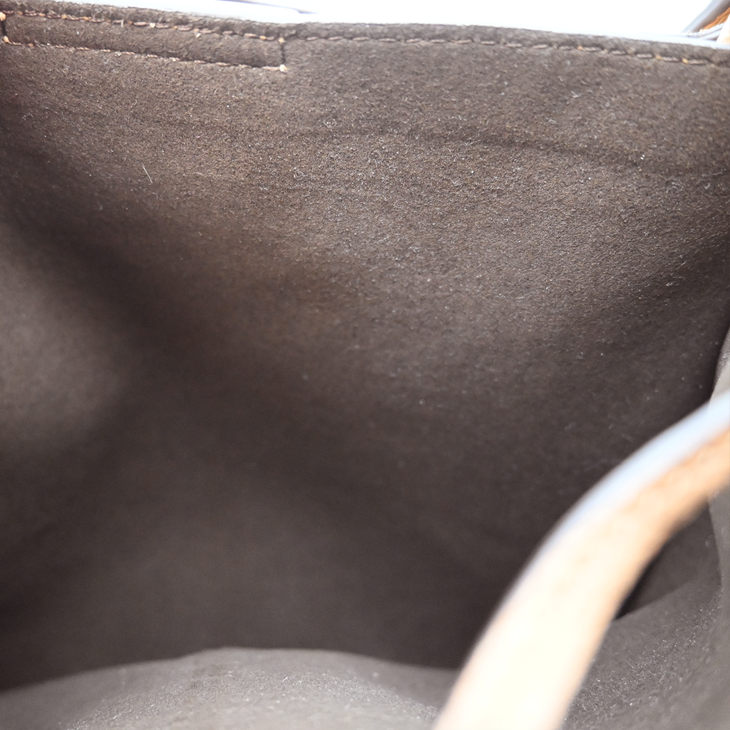 Gently used, with minor scuff marks & creasing at the upper leather. Minor wear at the top handles. Minor residue & signs of wear at the interior.