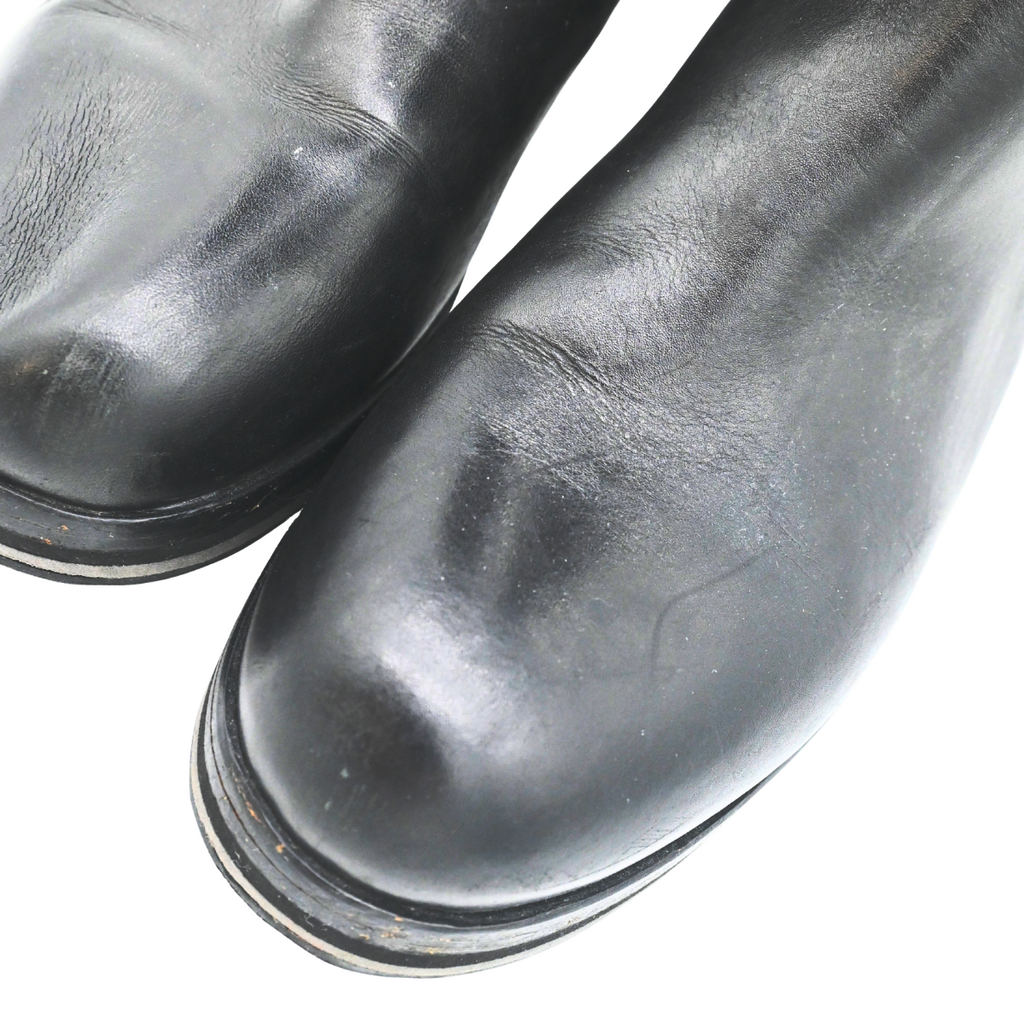 Used, with some wear at the soles & insoles. Creasing, scuff marks, & wear throughout the upper leather. Minor pulled threads & down.